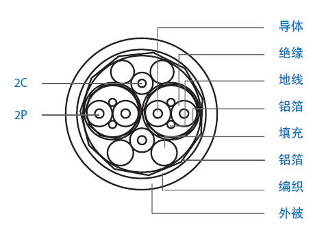 | 導體:25 AWG 鍍錫銅線(xiàn)7*0.18 | 半成品:2P+2C+填充, 一起成纜 |
